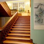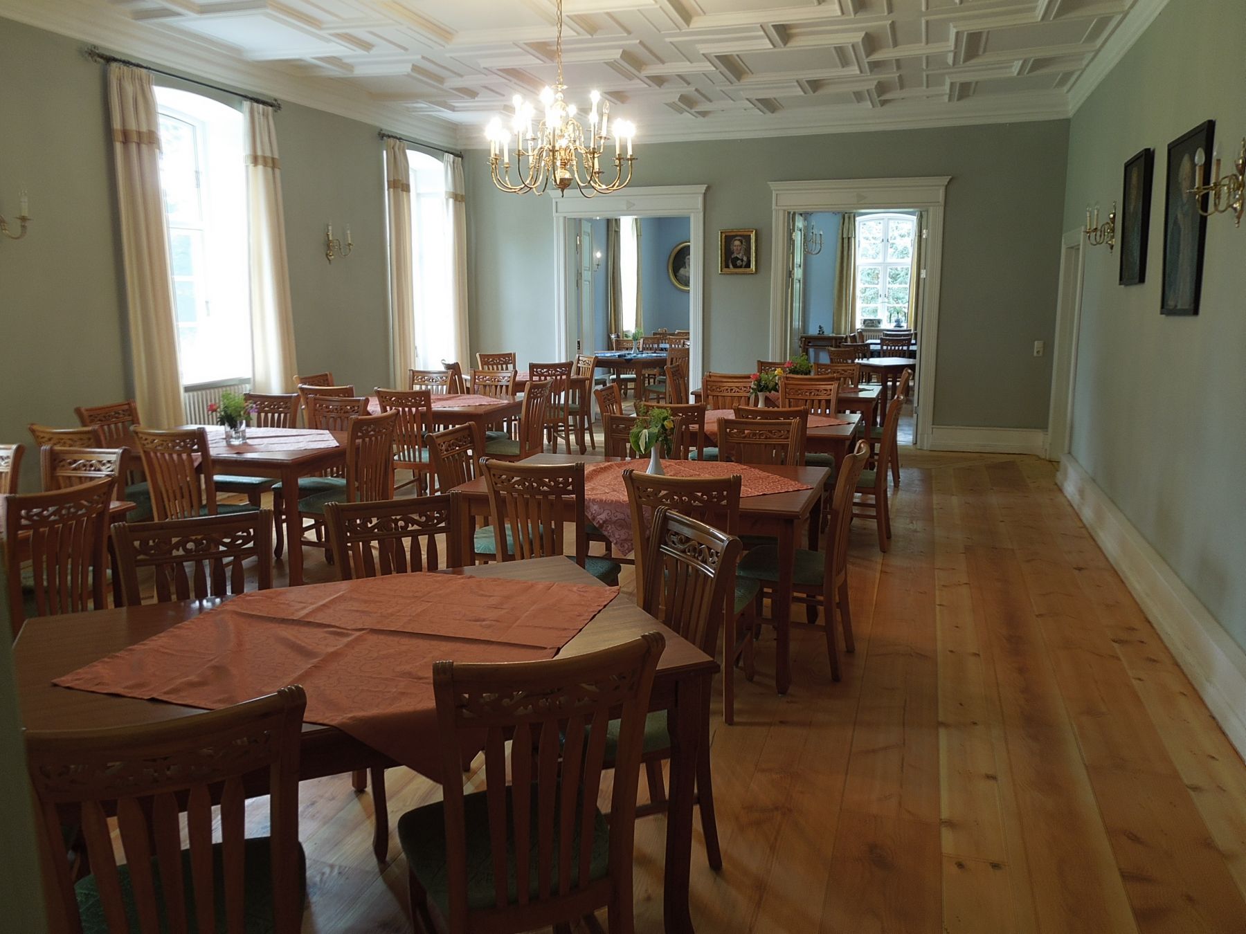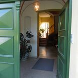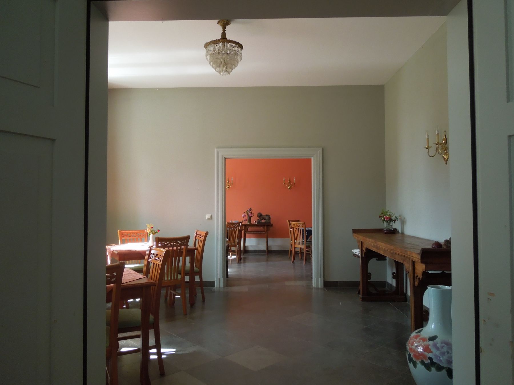 Der Hauseingang führt vom großen Saal in den Blauen Salon dann durch das Foyer ins Kaminzimmer zu den Gästezimmern.