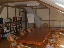 Zwei Säle, ein Turmzimmer, diverse Arbeitsräume stehen zur Verfügung und natürlich der große Park mit vielen eindrucksvollen und großen Bäumen.